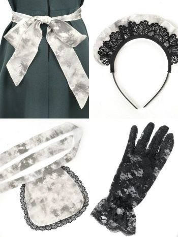 4. 【コスプレ】クラシカル 個性的 体型カバー フレアスカート ホラー 洋館 メイド 衣装5点セット [ワンピース/ジャボ/エプロン/カチューシャ/グローブ]
