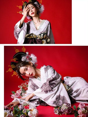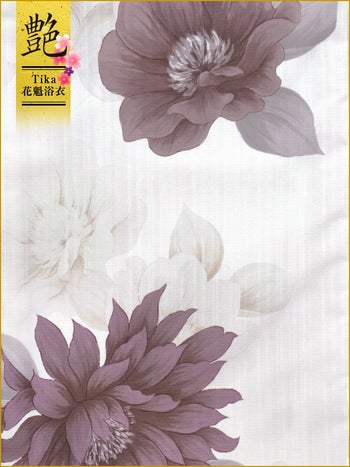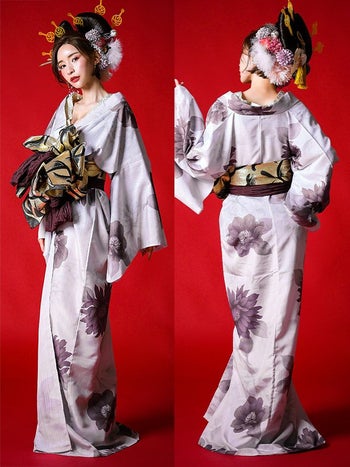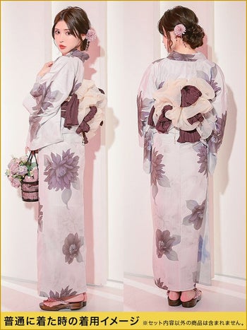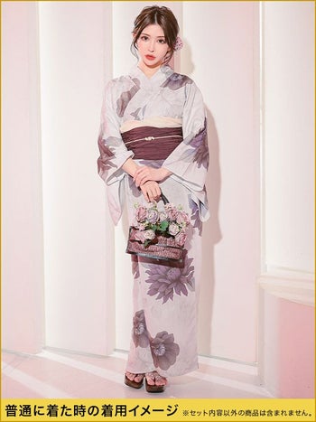 3. 【浴衣】花魁風 白地 牡丹柄 くすみカラー 2way 花魁ゆかた5点SET [浴衣+下駄+兵児帯+飾り兵児帯+肌襦袢]