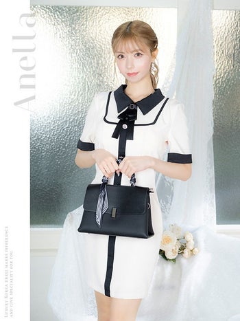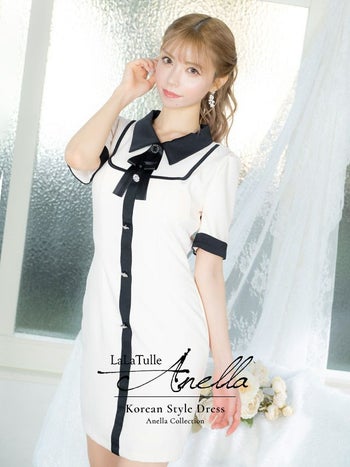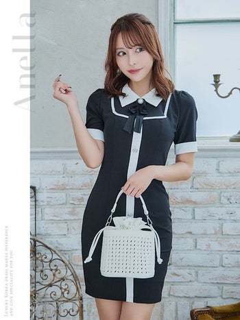 キャバドレス Anella 襟付き 半袖 リボン バイカラー ビジューボタン タイトミニドレス