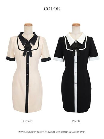 Lあり!同伴服や私服としても♡ 【Anella/アネラ】襟付き 半袖 リボン バイカラー ビジューボタン タイトミニドレス