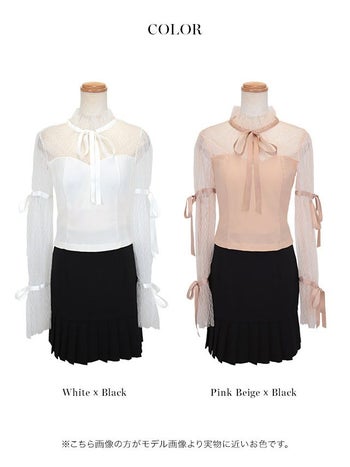 3. 【Anella/アネラ】長袖 ブラウス フリル ネックリボン レース プリーツスカート セットアップ フレアミニドレス