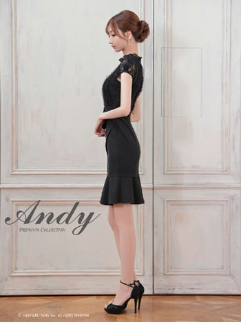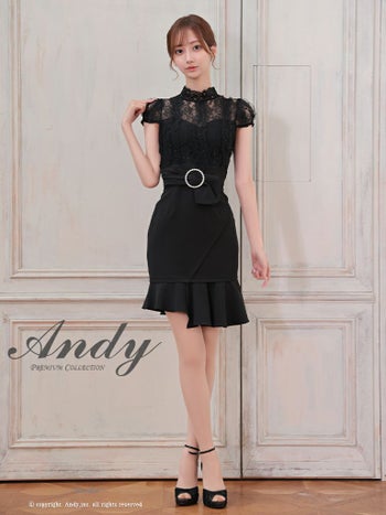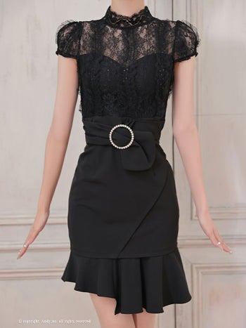 キャバドレス ミニドレス Andy アンディ アシンメトリー 裾フリル ベルト パールバックル レース ボトルネック 半袖 フレアミニドレス