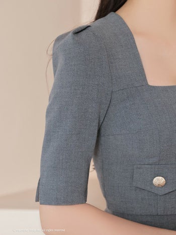 スクエアネック 袖あり セットアップ ジップデザイン 飾りボタン 飾りポケット フレアミニドレスの詳細画像2