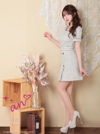 キャバドレス フリルミニドレス an アン ツイード 半袖 チェーン 飾りボタン プリーツ