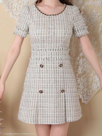 4. 【an/アン】ツイード 半袖 チェーン 飾りボタン プリーツ フリルミニドレス(aoc3355)