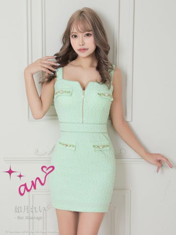 an[アン]ツイード フロントジップ チェーン パールボタン タイト 高級ミニドレス[XSあり][アップルグリーン][如月れい/高級キャバドレス着用][3451]