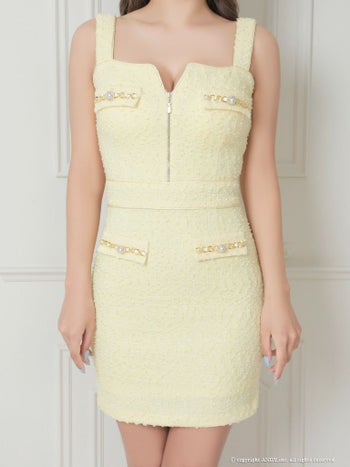 ノースリーブ ツイード チェーン フロントジップ パールボタン タイトミニドレス