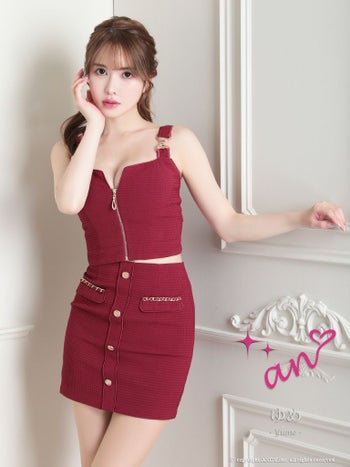 キャバドレス an アン セットアップ チェーン ワッフル バックリボン フロントジップ ノースリーブ タイトミニドレス