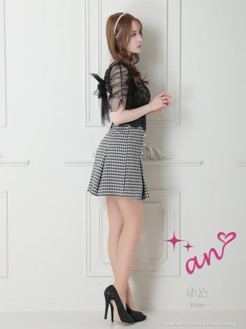 キャバドレス ミニドレス an アン ガーリー バックリボン ギンガムチェック チュール パールボタン 半袖 切り替え フレアミニドレスの詳細画像4