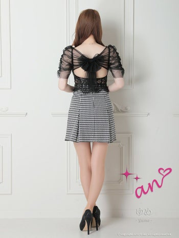 キャバドレス ミニドレス an アン ガーリー バックリボン ギンガムチェック チュール パールボタン 半袖 切り替え フレアミニドレスの全身バック画像