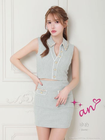 キャバドレス an アン チェーン パールボタン ツイード チェック柄 セットアップ ノースリーブ タイトミニドレスの全身フロント画像