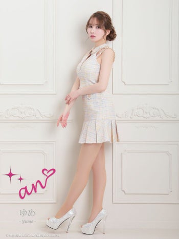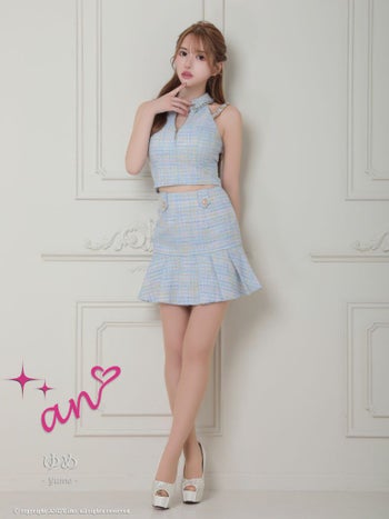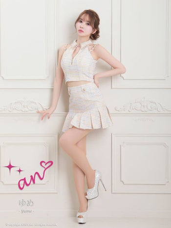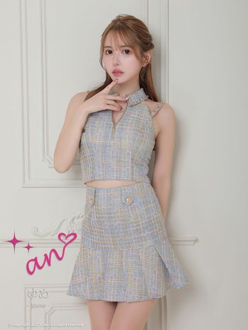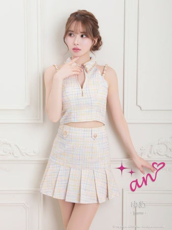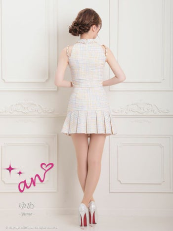 キャバドレス an アン 襟付き セットアップ ツイード チェック柄 ゴールドチェーンショルダー ノースリーブ プリーツスカート フレアミニドレス