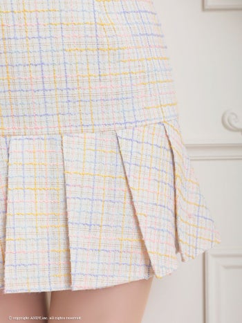 3. 【an/アン】襟付き セットアップ ツイード チェック柄 ゴールドチェーンショルダー ノースリーブ プリーツスカート フレアミニドレス(aoc3606)