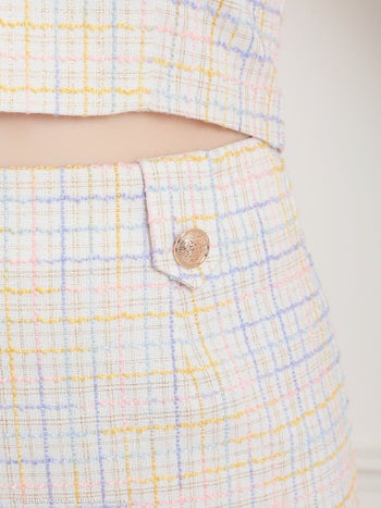 襟付き セットアップ ツイード チェック柄 ゴールドチェーンショルダー ノースリーブ プリーツスカート フレアミニドレスの詳細画像2