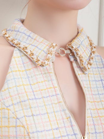 襟付き セットアップ ツイード チェック柄 ゴールドチェーンショルダー ノースリーブ プリーツスカート フレアミニドレスの詳細画像1