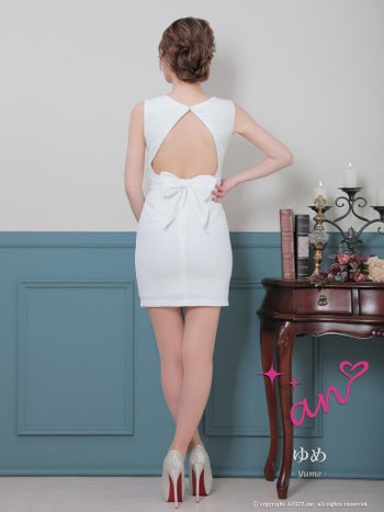 XSあり!バックの大きなリボンで後ろ姿も可愛い♡ 【an/アン】ワンカラー リボン カットアウト 金ボタン スリットネック ノースリーブ タイトミニドレス(aoc3633)