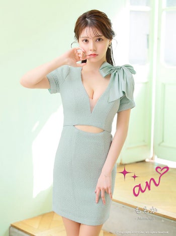 キャバドレス an アン ワンカラー シースルー リボン パフスリーブ 半袖 タイトミニドレス