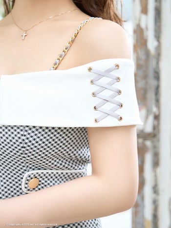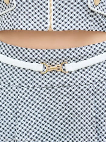 セットアップ チェック柄 オフショルダー ジップデザイン ベルト  スピンドル チェーン プリーツ フレアミニドレスの詳細画像2