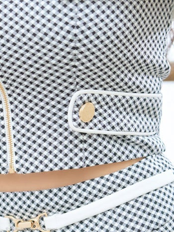 オフショルダー チェック柄 セットアップ ジップデザイン ベルト  スピンドル チェーン プリーツ フレアミニドレスの詳細画像4