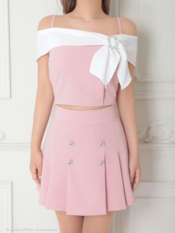 4. 【an/アン】セットアップ バイカラー リボン フレア プリーツ バックル オフショル フレアミニドレス(aoc3765)