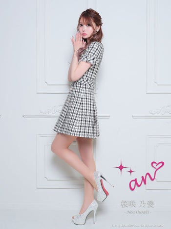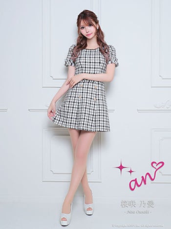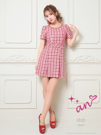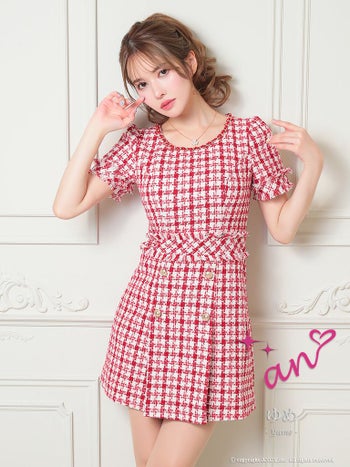 キャバドレス フレアミニドレス an アン 半袖 ツイード チェック柄 ゴールドボタン チェーン
