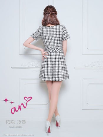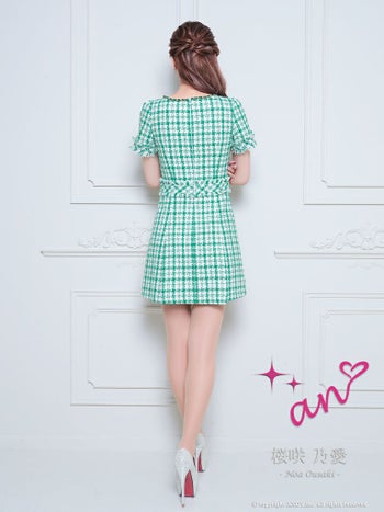 4. 【an/アン】半袖 ツイード チェック柄 ゴールドボタン チェーン フレアミニドレス(aoc3774)