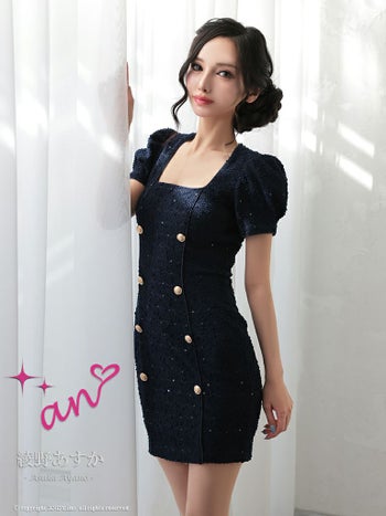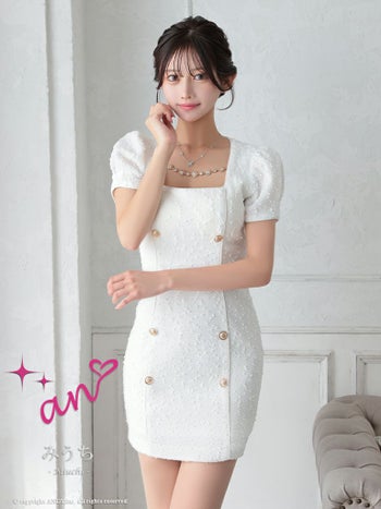キャバドレス タイトミニドレス an アン 半袖 スクエアネック パフスリーブ 飾りボタン ビジューチェーン