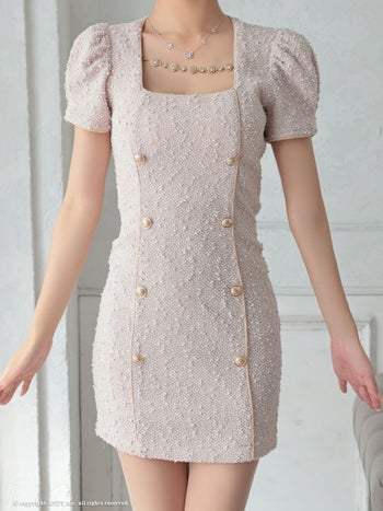4. 【an/アン】半袖 スクエアネック パフスリーブ 飾りボタン ビジューチェーン タイトミニドレス(aoc3779)