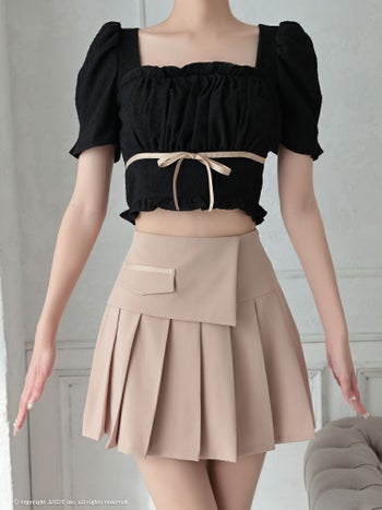 3. 【an/アン】バイカラー セットアップ プリーツ リボン パフスリーブ 半袖 フレアミニドレス(aoc3780)