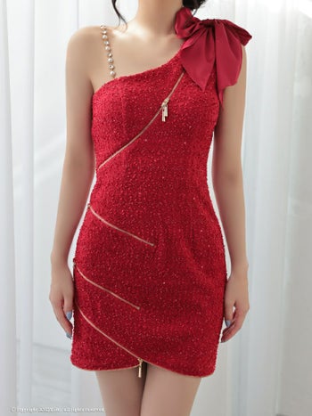 バックル ジップデザイン ビジュー リボン チェーン ワンショルダー タイトミニドレスのメイン画像1