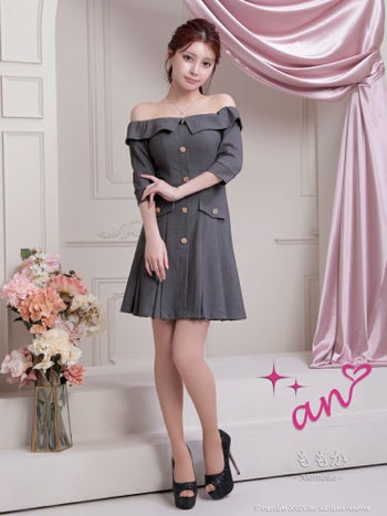 キャバドレス フレアミニドレス an アン プリーツ 袖あり オフショル 飾りボタン 飾りポケット