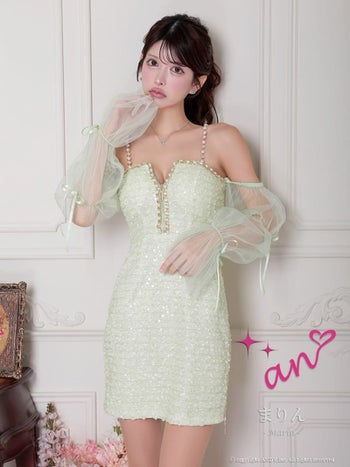 キャバドレス an ガーリー ジップデザイン 肩あき 長袖 スパンコール シフォンスリーブ リボン チェーン タイトミニドレス