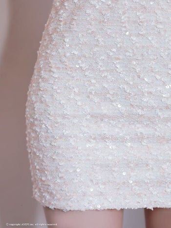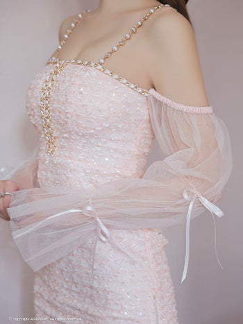 5. 【an/アン】ジップデザイン スパンコール 肩あき 長袖 ガーリー シフォンスリーブ リボン チェーン タイトミニドレス(aoc3813)