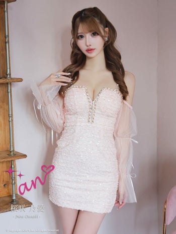キャバドレス an ガーリー ジップデザイン 長袖 スパンコール 肩あき シフォンスリーブ リボン チェーン タイトミニドレス