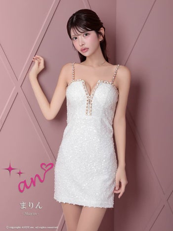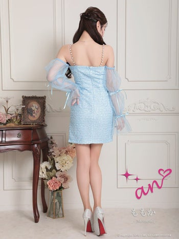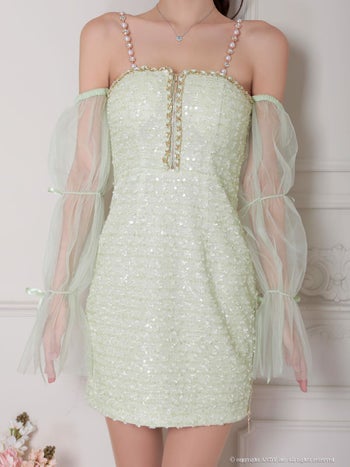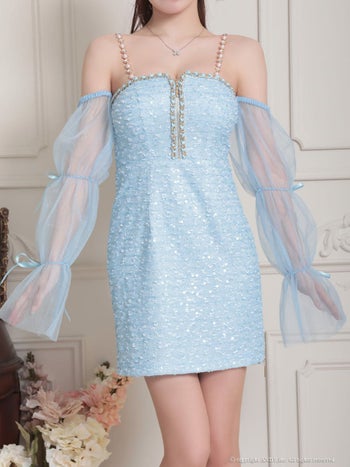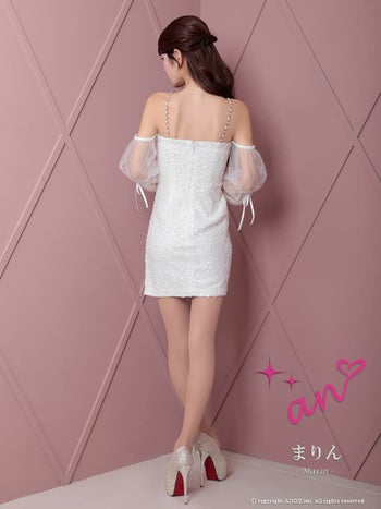3. 【an/アン】長袖 スパンコール ジップデザイン ガーリー 肩あき シフォンスリーブ リボン チェーン タイトミニドレス(aoc3813)