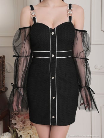 リボン ハートボタン チュールスリーブ ノースリーブ タイトミニドレスのメイン画像1
