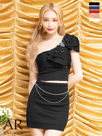 キャバドレス ミニドレス Angel R エンジェルアール リボン ワンショルダー ワンカラー パール チェーン セットアップ タイトミニドレス