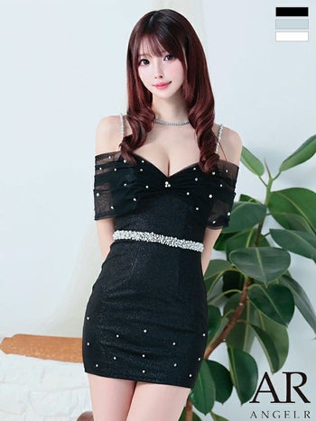 キャバドレス Angel R エンジェルアール ビジュー レース ウエストパール リボンモチーフ 肩あき ラメ ガーリー オープンバスト タイトミニドレス