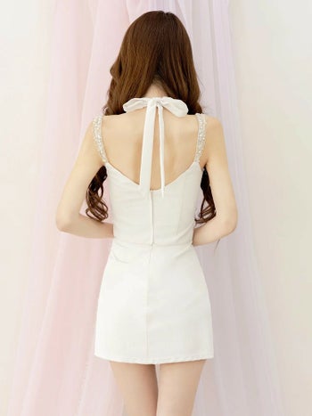 4. 予約商品【2月下旬入荷予定】【Angel R/エンジェルアール】オープンバスト ホルターネック リボン クロスビジュー パール セットアップ ガーリー フレアミニドレス (AR25213)
