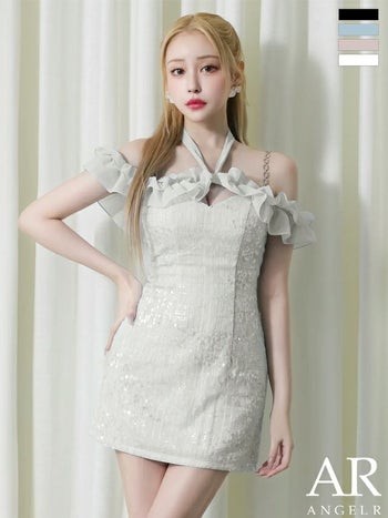 キャバドレス Angel R エンジェルアール ガーリー オープンバスト オフショルダー 2way 肩あき リボン ショルダーチェーン付き スパンコール フリル フレアミニドレス