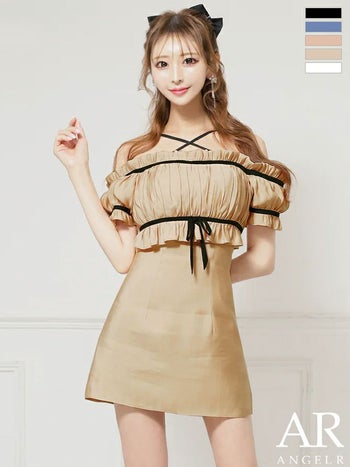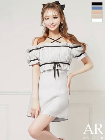 キャバドレス Angel R エンジェルアール バイカラー リボン 半袖 オフショルダー ギャザー ガーリー フレアミニドレス