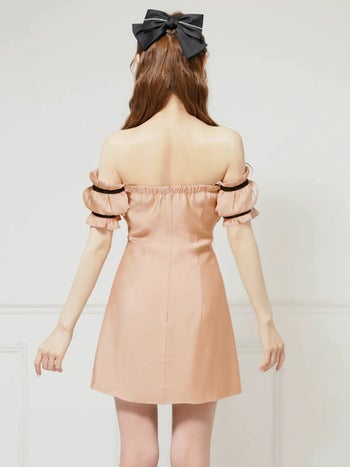3. 【Angel R/エンジェルアール】バイカラー リボン オフショルダー ギャザー ガーリー 半袖 フレアミニドレス (AR25228)