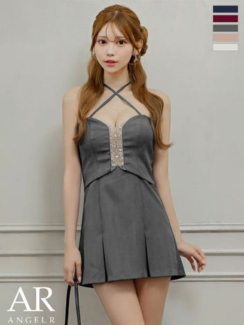 4. 【Angel R/エンジェルアール】オープンバスト クロスネックデザイン リボン ビジュー プリーツスカート フェミニン フレアミニドレス (AR25240)