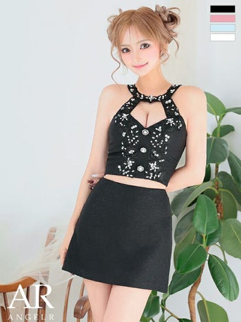 XSあり!気品を感じる一着♪ 【Angel R/エンジェルアール】ホルターネック バストカット ビジュー パールボタン フラワーレース セットアップ ガーリー フレアミニドレス (AR25306)