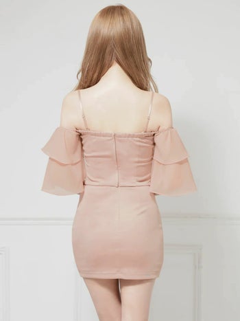 5. 【Angel R/エンジェルアール】バストカット 袖あり セットアップ オフショルダー ビジュー リボン シフォン タイトミニドレス (AR25332)
