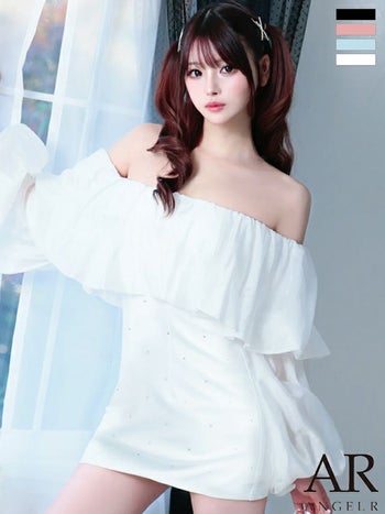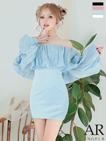 キャバドレス Angel R エンジェルアール 長袖 フリル ビジュー ガーリー オフショルダー パフ タイトミニドレス