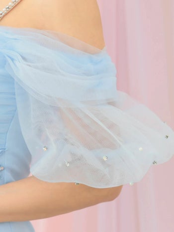 XSあり!気になる二の腕が隠せる♪ 【Angel R/エンジェルアール】肩あき シフォン フラワーレース ビジュー ガーリー オープンバスト タイトミニドレス (AR25817)