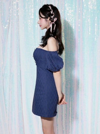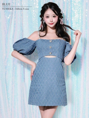 キャバドレス Angel R エンジェルアール ガーリー 肩あき チェーンショルダー パフ 半袖 ボタン ウエストカット デニム フレアミニドレス