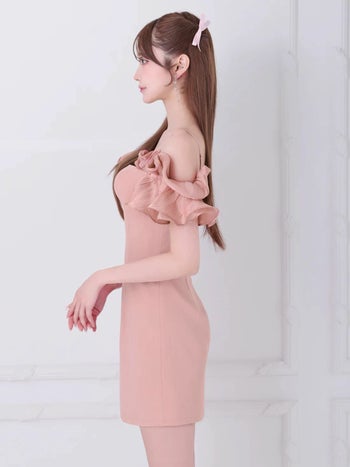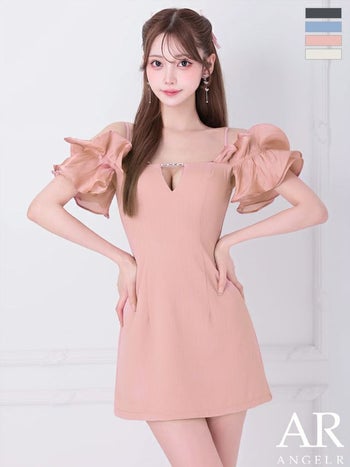 キャバドレス Angel R エンジェルアール 半袖 ガーリー 肩あき バストチャーム フリルスリーブ ビジュー フレアミニドレス