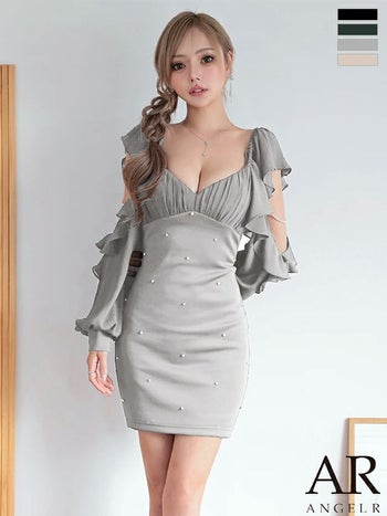 XSあり!動くたびに軽やかな表情を生み出す♪ 【Angel R/エンジェルアール】フェミニン バストカット 長袖 フリル スリット パールチェーン ビジュー タイトミニドレス (AR25871)